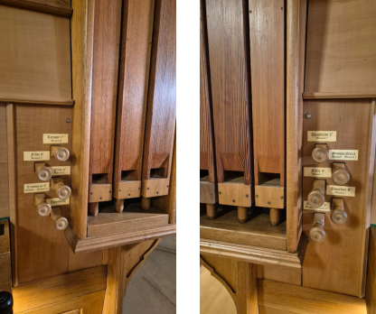 1er clavierBourdon 8Flûte 4Doublette 2Sesquialtera dessus2ème clavierFlûte 8Flûte 4Larigot 1 1/3 Cromorne 8 basse/dessusTremblantPédaleSoubasse 16Tirasse I - Tirasse II