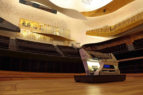 The Philharmonie de Paris is an exceptional architectural hub bringing together the Philharmonie 1, the new building designed by Jean Nouvel that houses the Great Hall opened in January 2015, and the Philharmonie 2, the former Cité de la musique designed by Christian de Portzamparc in 1995. Neither a "shoebox" hall (like the Musikverein in Vienna), nor a "vineyard" room (like the Berlin Philharmonic), the Great Pierre Boulez Hall of the Philharmonie invents a new model, that of an enveloping and modular room. An architectural, scenographic and acoustic innovation. Architect Jean Nouvel and the hall's chief acoustician, Sir Harold Marshall, designed the hall in collaborative sessions combining architecture, acoustics and scenography. Despite its capacity of 2,400 seats, the hall establishes a real intimacy. A very real sensation, since the distance between the conductor and the last spectator is only 32 meters (against 48 meters at the Salle Pleyel). Jean Nouvel describes the scenography as follows: "The evocative room of immaterial layers of music and light suspends listeners-spectators in space on long balconies ... This suspension creates the impression of being surrounded, immersed in music and light. » Jean Nouvel, assisted by Métra et associés (associated with the concert hall), developed with Marshall Day Acoustics and Ducks Scéno a bold system of cantilevered balconies and floating clouds combining envelopment, intimacy and spatiality. The stage offers the possibility of hosting any type of orchestral formation, even the most imposing. Source