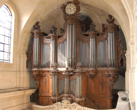 The organ was built by François-Henri Clicquot in 1759- 1761 (45 stops and 4 manuals and a pedal with a 'grand ravalement'). 1829: Maintenance by Louis-Paul Dallery (addition of a Bombarde at the GO). 1840: Maintenance by John Abbey (new wind supply). 1863: Renovation by Aristide Cavaillé-Coll: deletion of the fourth manual, addition of a Swell with 8 stops, replacement of several mutations and mixtures by 'symphonic' stops on the other manuals (a Gambe and an Unda Maris on the Positif, a Gambe and a Salicional on GO), a Barker machine for the GO, several 'pédales de combinaisons', extention of winchests from 50 to 54 notes for each manual and renovation of the wind supply applying various pressures. In the first half of the XXth century, works were carried out by Mutin, Bossier and Costa-Duval. In 1961, a restoration was performed by Beuchet-Debierre: extension of manuals to 56 notes, installation of a new 30- note pedalboard, repositioning of the swell pedal, using a toespoon, from the extreme right to the middle of the console. On the Grand-Orgue, a poor Quinte, not from Clicquot nor from Cavaillé-Coll, was replaced by a new one, and a 4' Flûte replaced the second 4' Prestant (which was relocated on the Swell). On the Positif. Gambe and Unda Maris stops were replaced by a 4' Flûte douce and a 1 3/5' Tierce, and a 1 1/3' Larigot was added. An additional winchest was built for the Swell to house the following stops: 8' Principal, 4' Prestant, 2' Doublette, and Plein-Jeu. In 1987 a thorough restauration was carried out by Théo Haerpfer (Manufacture Lorraine de Grandes Orgues), restoring the creation of Cavaillé-Coll in 1863. In 2018-2025, the organ was renovated by Lacorre & Muhleisen. They reused a large part of the existing organ to achieve a sound palette that was more romantic than classical. In addition, all the mechanisms have been changed to bring them ‘up to date’. More info (in French)