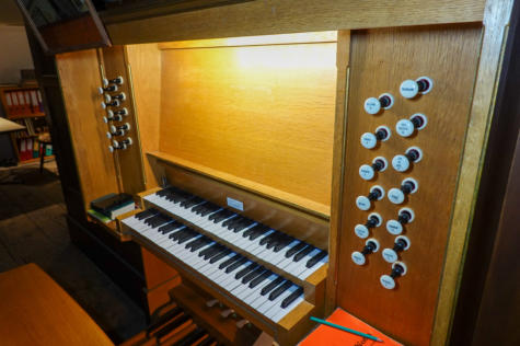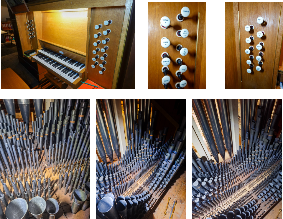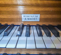D5The first organ in the chapel dates from the nineteenth century. The date of construction and the name of the postman are unknown. The organ was probably built during the first third of the nineteenth century. A platform bears the date of 1848, the probable date on which the organ was installed in the chapel. It was redesigned at the beginning of the twentieth century by Charles Mutin (the precise date is also unknown). He profoundly transformed the organcase and kept only the upper part, which was separated into two bodies on either side of the console. The instrument was equipped with pneumatic action. In 1984, organbuilder Adrien Maciet rebuilt the instrument by reconstituting the original case. He reused many pipes and completed the instrumental part with stops from the Chéron organ in Mortain. A restoration by Alain Léon was carried out in 2023. The organ has 2 manuals of 56 notes and pedalboard of 30 notes.